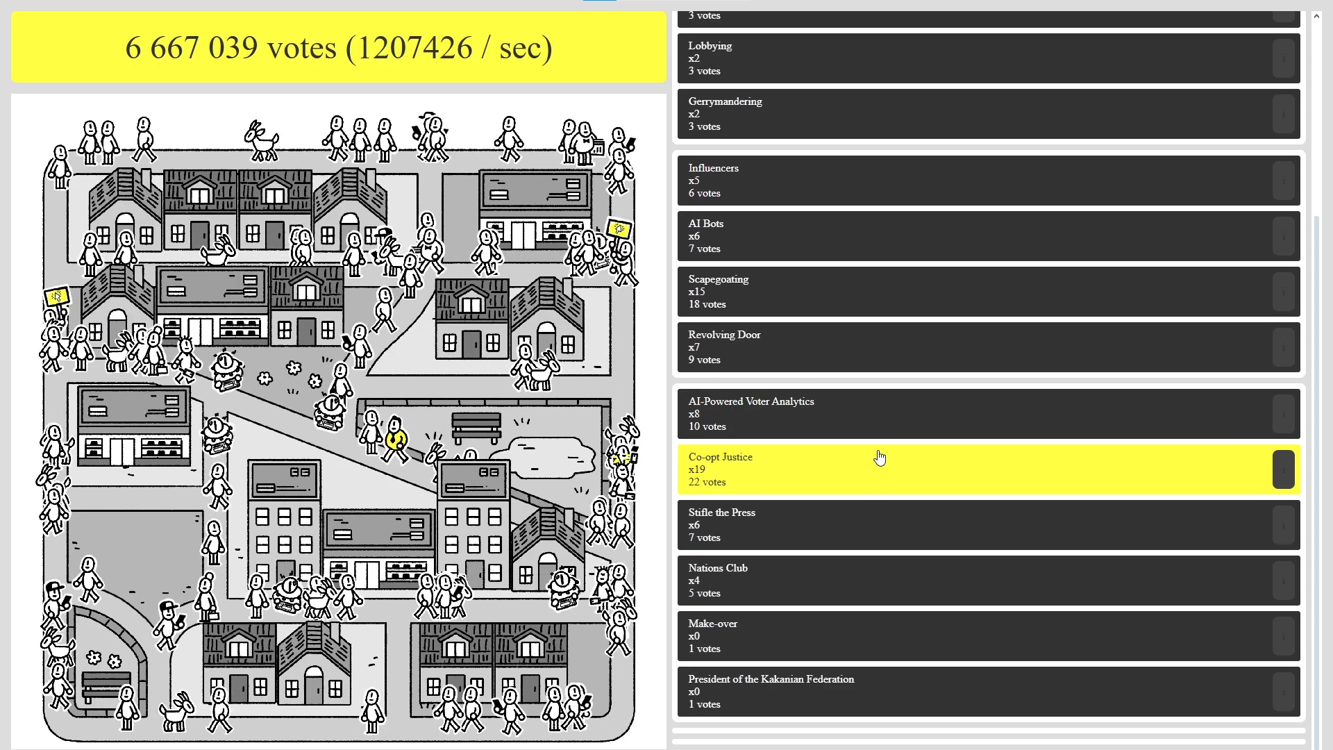 President of the Universe Clicker (PotUC) is an idle clicker game where you play as an ambitious citizen of Kakania, launching your first political campaign. Click to gather votes and recruit others to click for you—but in this world, votes equal power, and power equals money. Why take the scenic route? Spend your votes directly on goods and services. Every decision comes with consequences that will challenge your conscience. Each upgrade draws from real political events, giving your choices a sobering edge. Will you stay true to your principles, or become consumed by an endless hunger for power?