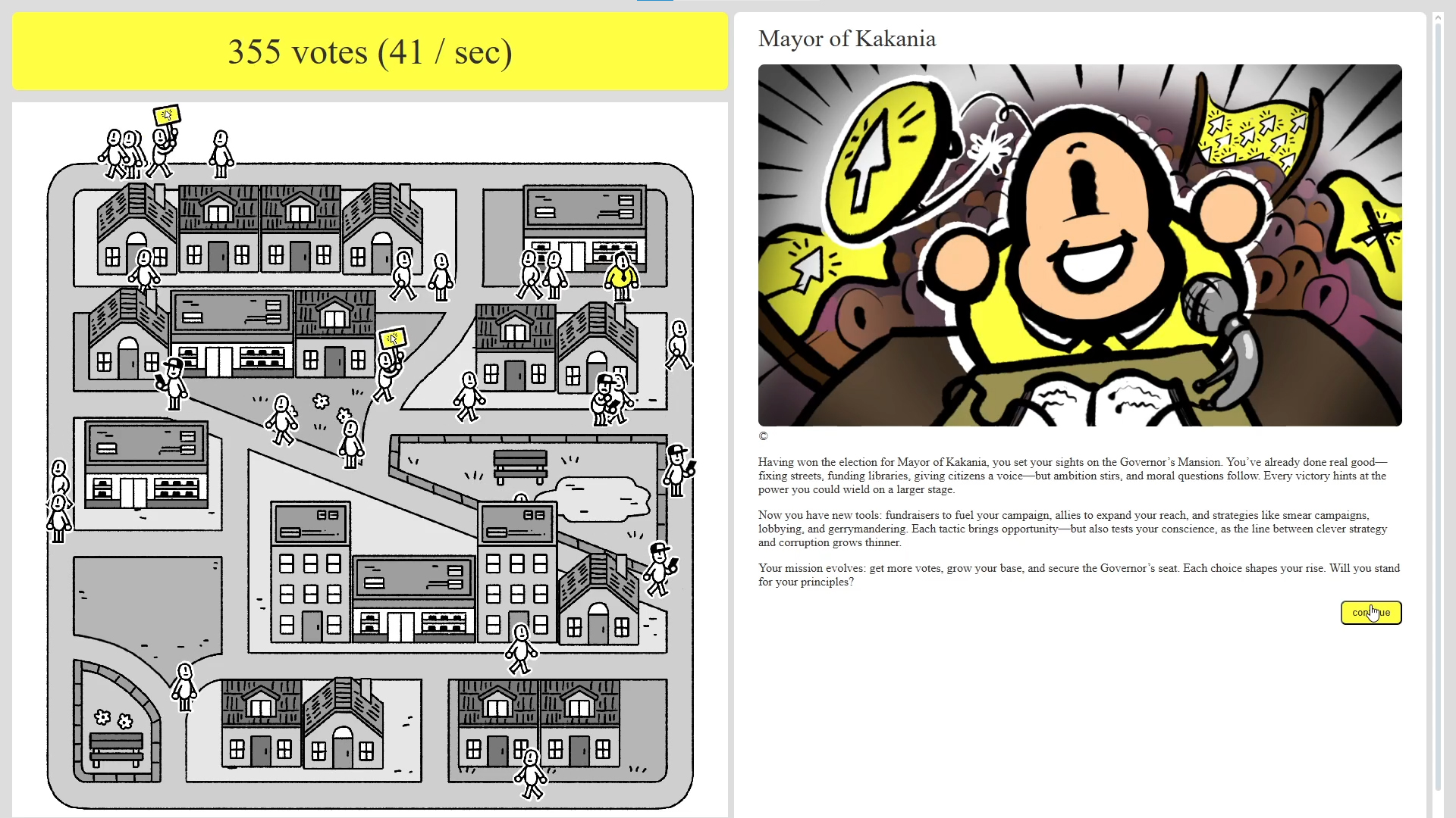 There’s much to learn. Eye-catching campaign materials, persuasive rhetoric, political propaganda—every tactic is new, every lesson a step toward influence. You begin as a committed democrat, winning trust one vote at a time. The rallies, late-night strategy sessions, and frantic scramble for funding test your resolve and sharpen your ambition. Yet with each triumph, a question lingers: when does popular support tip into unchecked power? When does a leader chosen by the people become something else entirely? Each vote you collect brings both a thrill and a warning—how far will you push the limits?